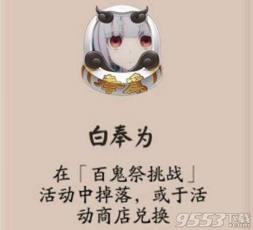 阴阳师白奉为头像框获取攻略: 百鬼祭挑战活动期间,玩家成功挑战,可获得百鬼祭徽章,徽章可用来兑换白奉为头像框。当然还可兑换其他奖励。