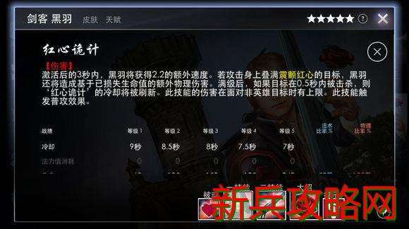 五层的红心机制,一是让黑羽在线上对拼的时候有持续的输出保障,二是为1技能和2技服务,提高斩杀线和额外的伤害。如何在对局中给敌方一个和多个英雄叠加被动层数是最重要的一环,我会在“对线和团战要点”上详述。