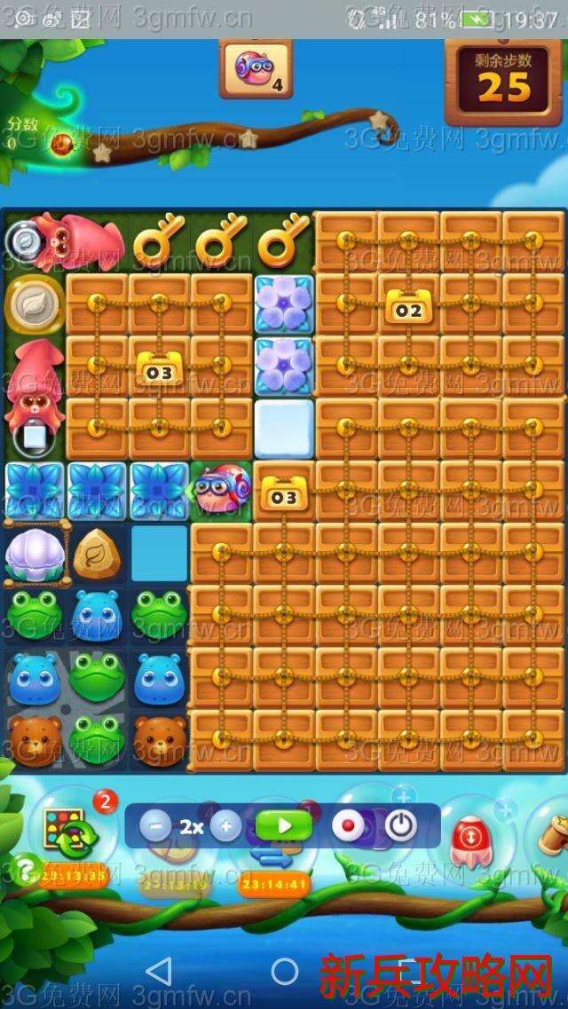 1.迅速打魔法石和水母宝宝,用魔法石打雪块,水母宝宝打银币,让墨鱼宝宝清除上面的🔑,有两把🔑出现。