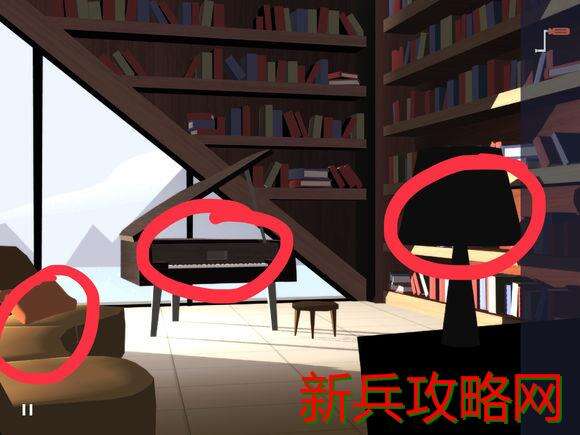 上二楼书房,先熟悉一下图表示的三个位置,在书架上拿到吸铁石,回到进门的玄关处