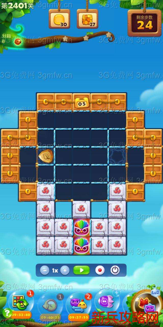 1.固定开局交换双鸟全屏消除一次,开启封印石板点亮星星瓶并释放小叶堆。