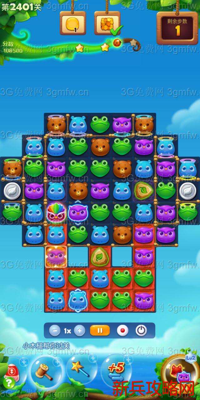 树叶不难消,难在收蜂蜜,需打破所有蜜罐才能收齐。以打上魔法石为主,没好的步数可打下魔法石打开局面。钥匙打破最上面树叶才出现,更新后第一关不难,裸打过关。