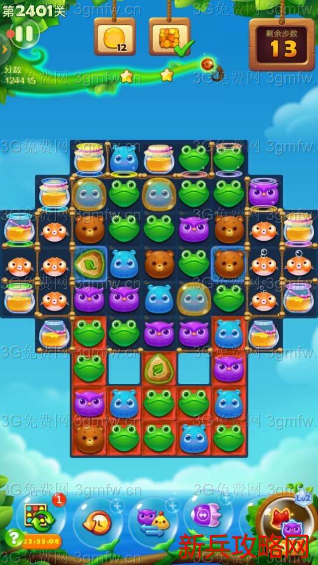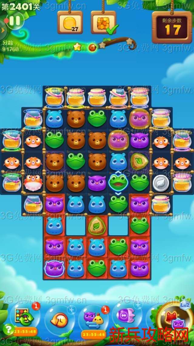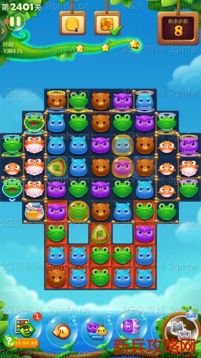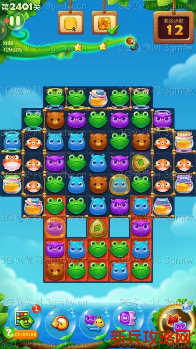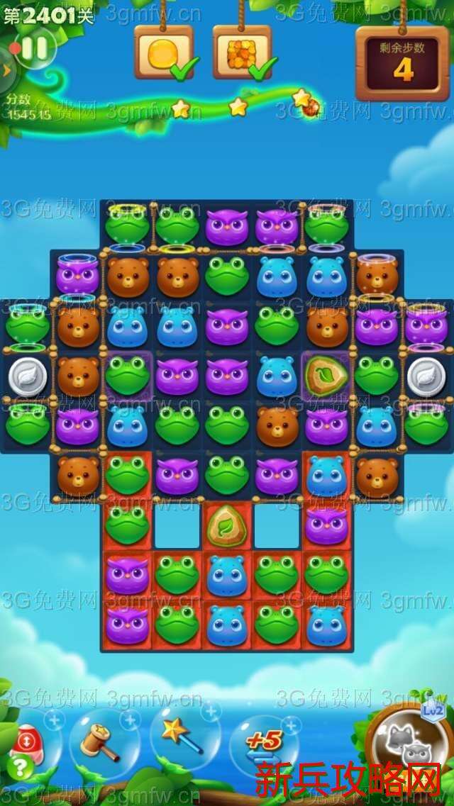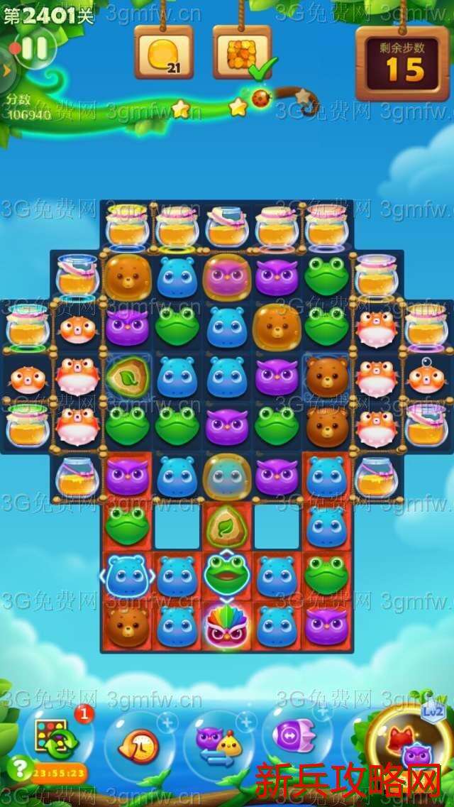 开心消消乐2401关卡买+3步。开始互换双魔力鸟清屏消除,接着双精力瓶出现并发亮,树叶散开覆盖钥匙。互换双精力瓶清屏消除,树叶减薄。玩了几次,发现过关的重点在多击打底部的那块魔法石。引爆气鼓鱼,尽快消除完钥匙,出现蜂蜜罐。这时要做就是打底部那块魔法石,上面有小动物掉落并打到蜂蜜罐。最好组一次魔力鸟和直线特效互换,出现很多蜂蜜。上面两块魔法石总有一边隐身一块。玩了几次,过关了。