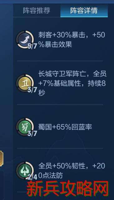 5刺客+三长城+3蜀+双辅,由于上次更新削了长城属性,3长城和7长城只差2%的属性加成,而为了2%属性牺牲4个上场位置显然是不可取的,所以3长城属性性价比还是很高的