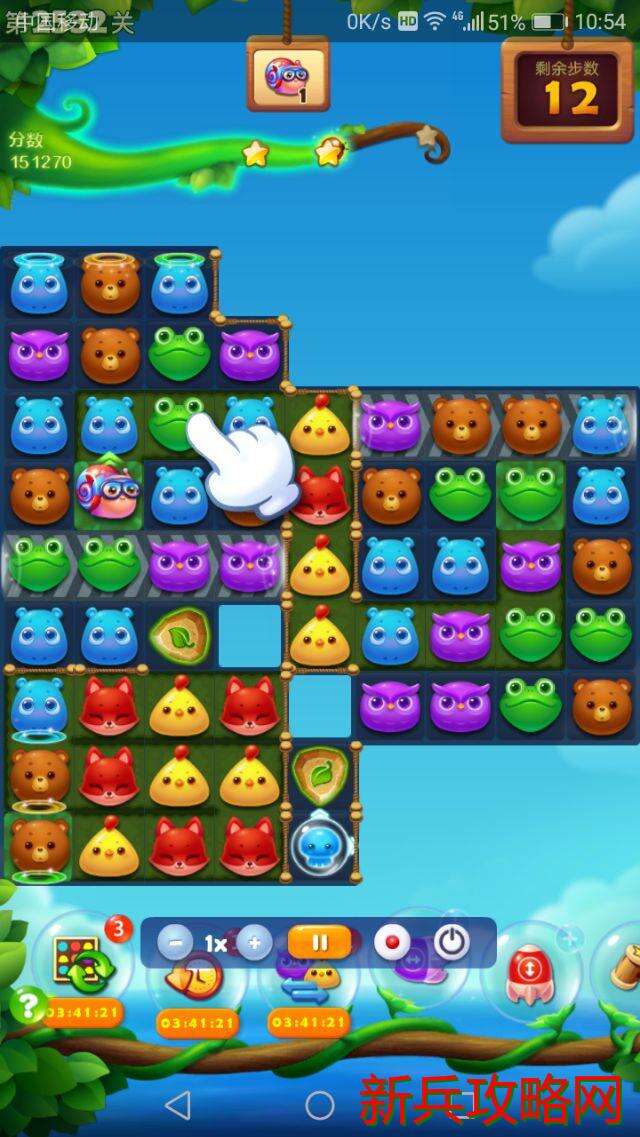 打花团消毒液送走11只蜗牛。打两个魔法石:打上边那个可以消除魔法药水和魔法罐使蜗牛出现,打下边那个为了激活水母宝宝。蜗牛刚出来时三消或在左下方组特效把它送到中上方,打下边魔法石带动水母把它往下送,再在右边三消或组特效把它送到终点。