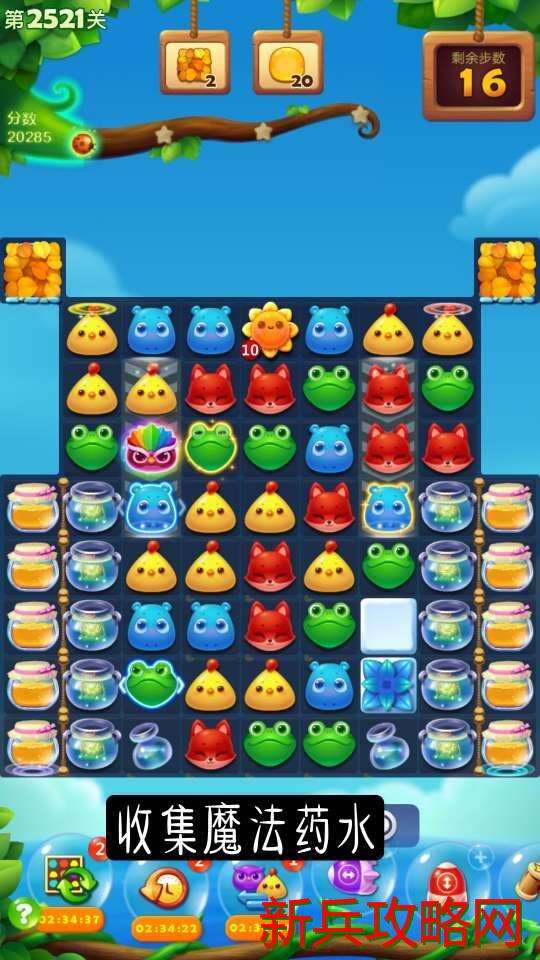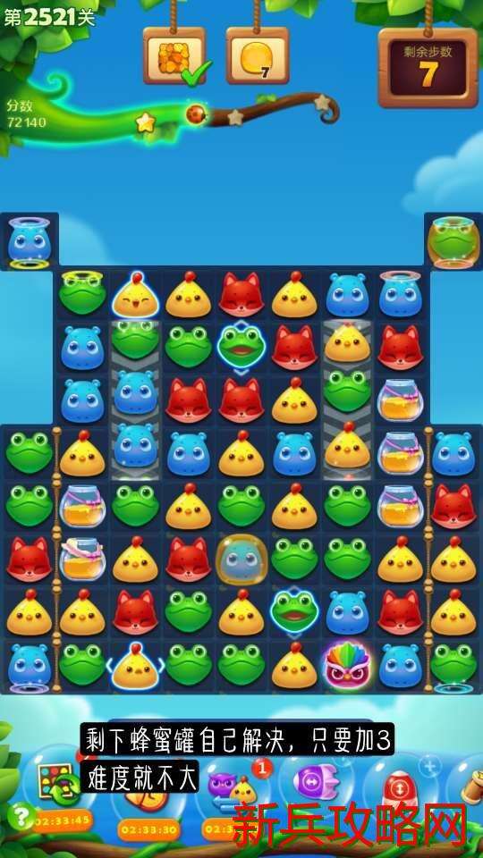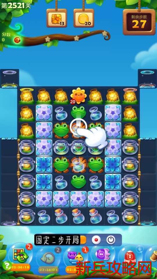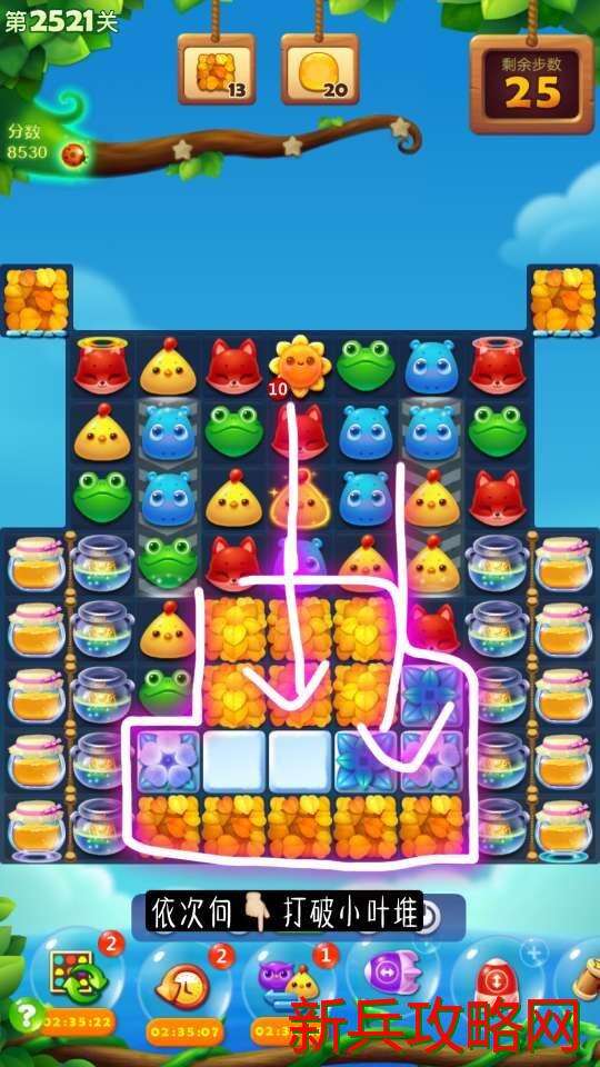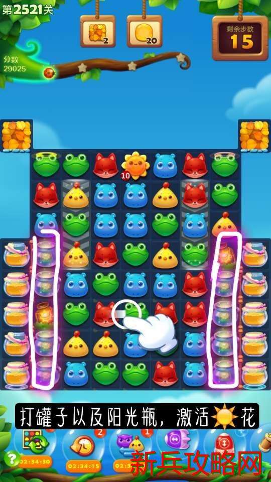 左上角落个蜂蜜,怎么也打不掉,只好用个魔法棒过关,感到此关不容易上分。先得把药水瓶打破,上面的树叶,太阳花开放后打掉。