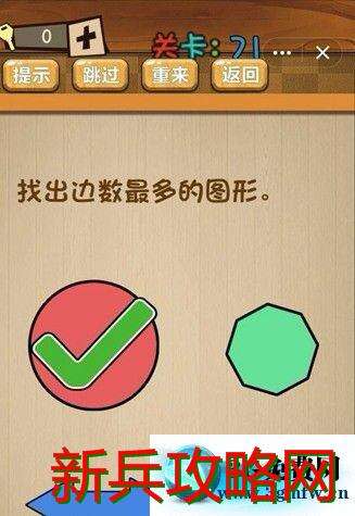 时间:2019-11-20 11:42:00 来源:新兵攻略网 阅读:神脑洞游戏第71关《找出边数最多的圆形》答案攻略,第71关 神脑洞游戏 找出边数最多的圆形