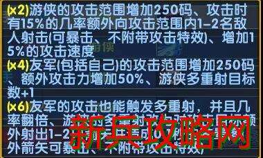 游侠(X6)羁绊效果:友军的攻击也能触发多重射,并且几率翻倍、游侠的多重射改为对攻击目标额外射出1-2只箭矢并造成0.1秒的眩晕(额外箭矢可暴击、不附带攻击特效)