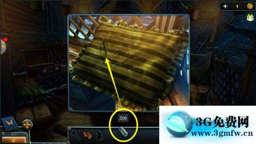 再点击右边椅子上的枕头,用【刀片】割开枕头上的缝线处,拿到【钥匙】。