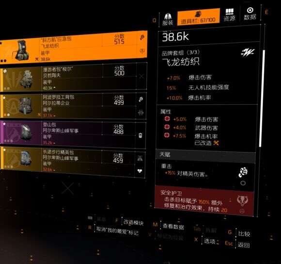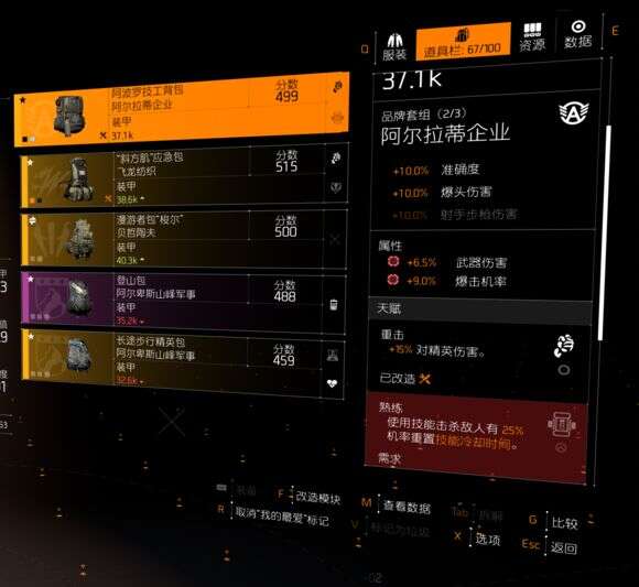 背包的选择也比较宽泛。主要看的就是红色词条的数量和质量,最佳选择飞龙和阿尔拉蒂,也可以选其它任意牌子的,只要红字属性好即可,如果遇到需要固定搭配的情况就必须飞龙。
