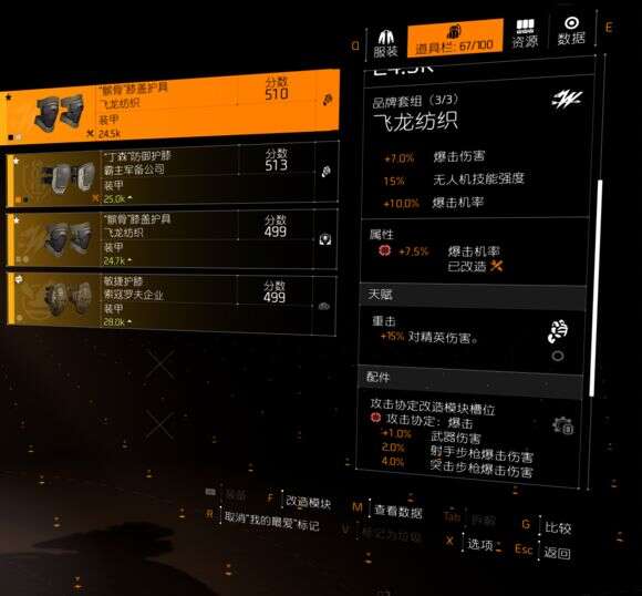 护膝跟胸甲一样,都是3种配装里的必要固定品牌,只能选择飞龙(但不是说其它配装也必须这样,也可以3飞龙放在面具/枪套/背包,只是我不推荐)。