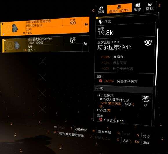 手套是选择最多也是最少的一个部件。为什么呢?因为我给出的3种配装优先选择都是阿尔拉蒂品牌,有两种配装是单阿尔拉蒂,可以获得10准度,另一种是双阿尔拉蒂,还有额外10爆头加成。但是任意其它品牌也都可以用。