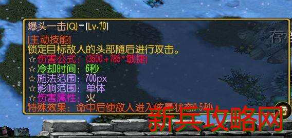 Q技能,伤害中规中矩,CD一般,距离一般,眩晕0.5S基本上可以理解为打断效果,可配合其他技能使用多次打断小BOSS技能(此外练级时要注意的是这个技能的攻击距离是随着技能等级提升而提升,1级Q貌似距离很短很短)
