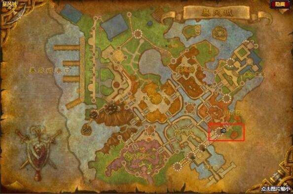 联盟方:徽记的兑换地点在暴风城的旧城区,如上图所示的位置,找到NPC军士长贝金斯即可兑换,具体坐标为75.6,66.6,如上图所示的位置。