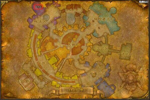 2、铁炉堡传送门训练师位于,铁炉堡中秘法区的位置,如上图之中所示,具体坐标为25.5,7.1,名字叫贝尔斯塔弗·风暴之眼传送门训练师。