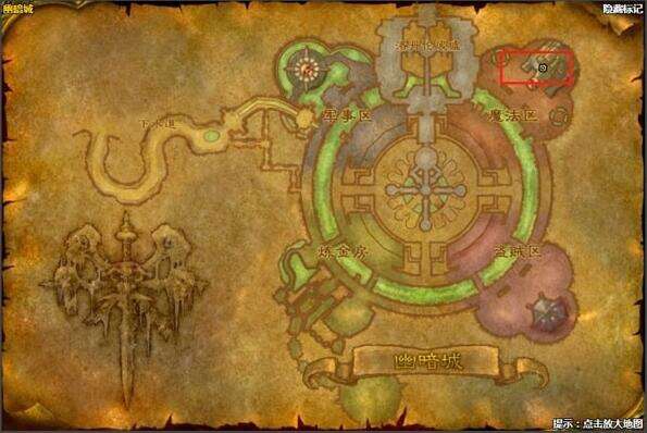 3、幽暗城传送门训练师位于,幽暗城中魔法区的位置,如上图之中所示,具体坐标为84.2,15.6,名字叫莱克斯顿莫泰姆传送门训练师。