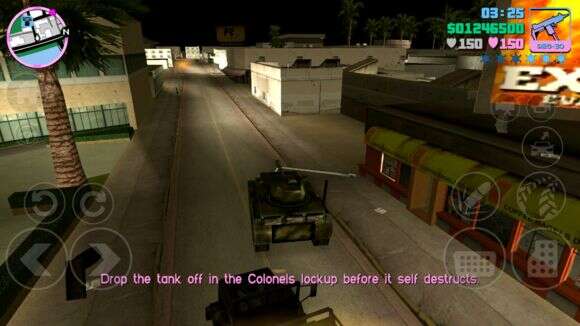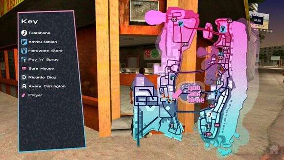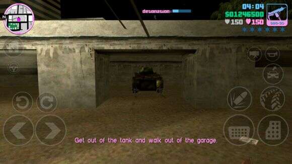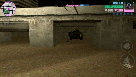 然后我们可以让任务失败一次,把车直接往北开,将Rhino保存于Hyman Condo的车库里,Hyman共有3个车库,将它保存于最外侧的车库里,那是VC里最大的车库,另外两个高度有点不够,进出不太方便。具体位置如下,只需要等着Rhino自己爆炸任务失败然后车库关门翻新车辆,再打开车库门验货。开到这里你只需要把炮管往后转,然后一路开炮推到这里,警察的路障之类的东西拿你一点办法都没有。