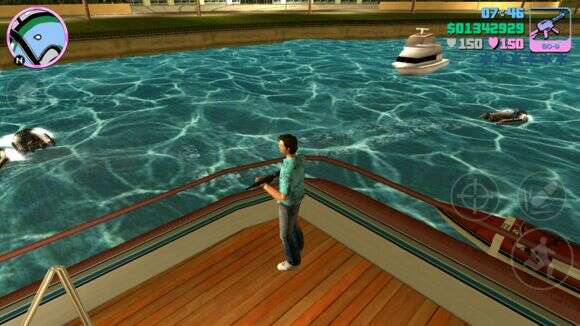 接着船开到了罪城北部,他们设置了一整排船拦截游艇,同时又有一班人马驾驶橡皮艇来攻打游艇,此时再次发挥自动瞄准的优越性,干掉他们。