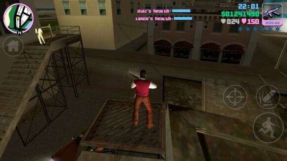 接着我们继续这个任务的流程,动画结束后爬上楼梯,站在高台上,等着古巴人来,古巴人来后不久海地人也跟着来了,现在你要做的就是大开杀戒,利用移动端自动瞄准的天然优势进行射击,闭着眼睛也能把人杀了。在此时你只需要保证你以及Lance和Diaz活着就行了,其余的不要管他们。