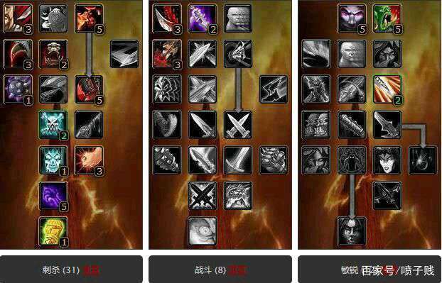 刺杀21点,点出冷血。战斗8点,点出背刺或命中。敏锐22点,点出伺机待发。这个天赋是60年代最经典,盗贼使用最广泛的天赋,贼皇shurrik当年的视频完美的诠释了这个天赋。在PVP里,21 8 22还是最完整的天赋, 野外作战,决斗, 擂台, BG, 5v5, 10v10, 打所有职业都没有绝对天敌。这套天赋打冰法是最强的,它的缺点是太平均, 特色多而不精, 除了冰法打任何其他职业都不是最强。爆发不如封印命运, 在集体作战里, 无论是RAID输出还是5V5, 在用完预备以后还是弱了一些。 当然, 预备本身就是盗贼最硬的底牌。