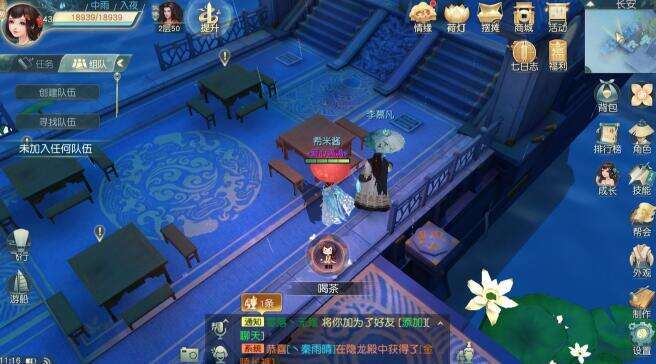 玩家需要在这个四个桌子中点击喝茶,然后稍作停留一下,这样的话就会出现两个NPC进行对话,然后之后他们离开的时候,就可以触发这个澄心无忆奇遇任务了。