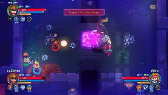 挑战房间里遇到克朗比较多,如果房间四角有叭叭啦的话优先打掉叭叭啦,否则不小心踩到混乱是很难受的,打boss的节奏一般是打两下后调整位置,boss跳跃攻击时会有范围提示,及时走出红圈就行。