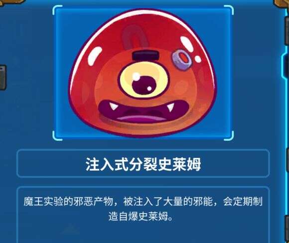 第三个就是史莱姆啦,史莱姆的攻击方式单一,只会使用跳跃攻击,原生史莱姆和自爆史莱姆威胁不大,但挑战房间的史莱姆(就是下面这货)会分裂很多自爆史莱姆如果放任不管,自爆史莱姆会越来越多。