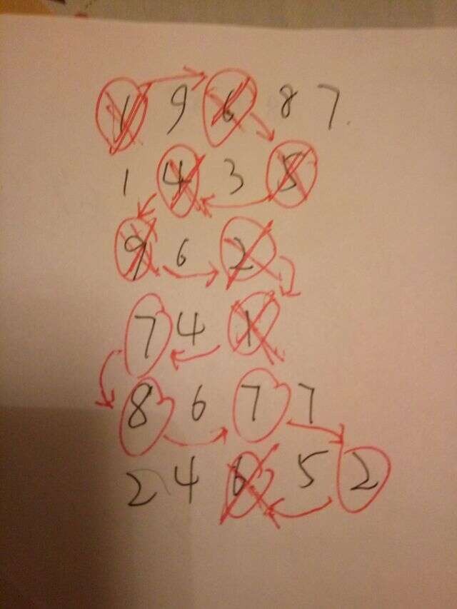 这里是一个锁图,楼主把钥匙数字已经用红圈圈出来了而且都画❌了,玩家老爷们发现规律了吗?那些没有被画❌的就是解开地板盒子的密码。【怎么解释原理呢,其实就是把代表钥匙的数字在代表锁的数字上画出来,且代表锁的数字每一横行之间都隔一个数字,这样连线,之后除掉代表锁的数字,就是盒子的密码】
