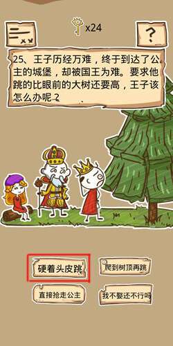 史小坑的烦恼5第24关【王子历经万难终于到达了公主的城堡却被国王为难要求他跳的比眼前的大树还要高王子该怎么办呢】答案攻略