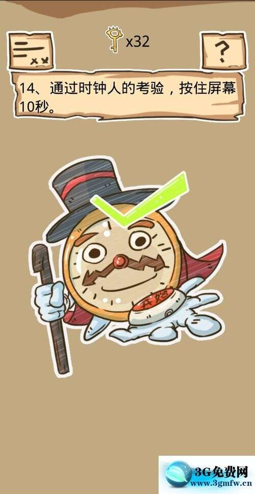 答案:手指按住时钟人10秒,然后松开手就过关了。