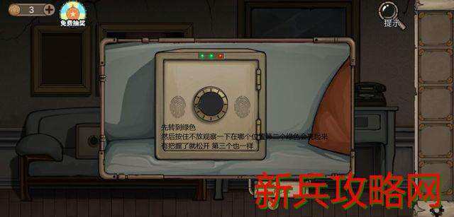 然后开保险柜 先转到绿色 然后按住不放观察一下在哪个位置第二个绿色会亮起来有把握了就松开 第三个也一样 这个箱子就看手速(能气死人)