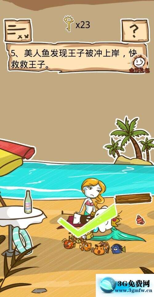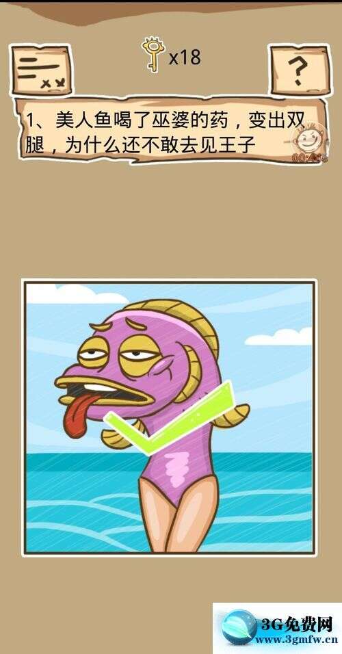 第1关手指按住美人鱼的腿,然后向下拖动看到美人鱼的头就过关了。