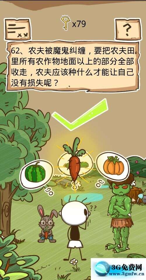 第62关先将左边的兔子,拖动到史小坑旁边,然后点击兔子手上的红萝卜就过关了。