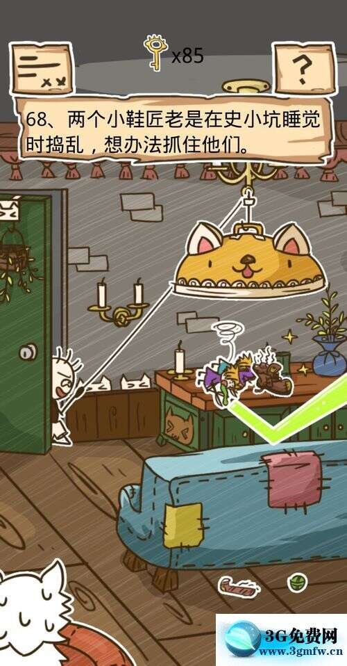 第68关将沙发旁的鞋子,拖动到桌子上的鞋子处就过关了。