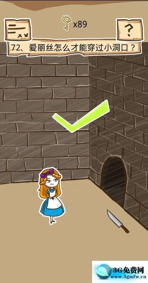 第72关用两根手指,一根手指向下滑动,一根手指向上滑动,将爱丽丝缩小就过关了。