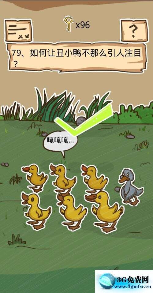第79关将丑小鸭拖动到小黄鸭右边就过关了。