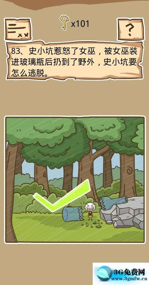 第83关将手机横过来,瓶子碰到石头就过关了。