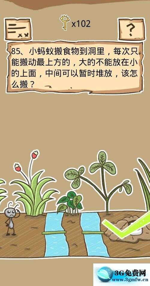 第85关先把左边最上方的食物拖动到蚂蚁家,接着把中间的食物拖动到两条河中间,然后将蚂蚁家的食物拖动到中间。将左边的食物拖动到蚂蚁家,接着将中间最上方的食物拖动到左边,然后将中间的食物拖动到蚂蚁家。最后将左边的食物拖动到蚂蚁家就过关了。