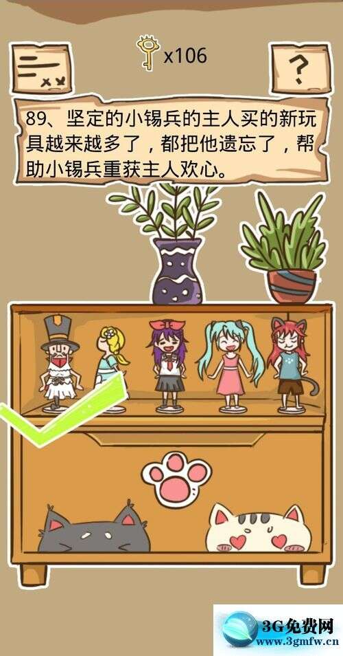 第89关将右边的女装拖动到小锡兵身上就过关了。