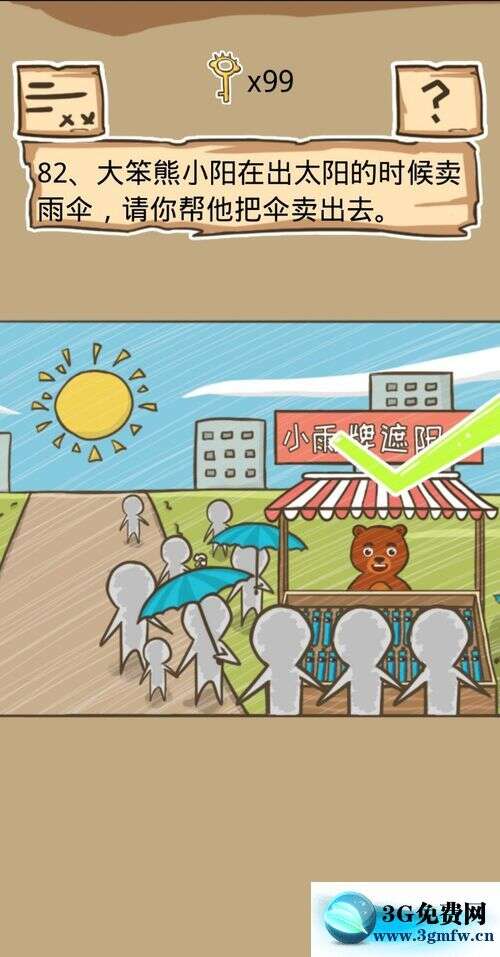 时间:2019-05-02 22:45:00 来源:本站整理 阅读:史小坑的烦恼5第82关【大笨熊小阳在出太阳的时候卖雨伞请你帮他把伞卖出去】答案攻略,第82关 史小坑的烦恼5 大笨熊小阳在出太阳的时候卖雨伞请你帮他把伞卖出去