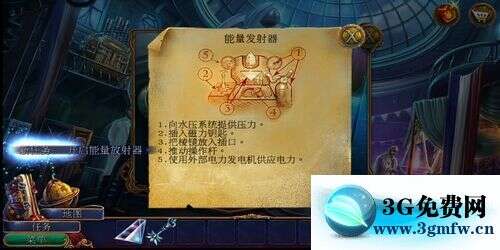 开局先从包里拿到笔记本和棱镜。 接着进入实验场馆,从父亲手里拿到钥匙。 拿到钥匙后,根据说明书,装好压力罐,放好钥匙和棱镜,并推动操作杆。 推完操作杆后,将发电机的电池推进去,然后拉动拉杆启动发动机。 启动发动机时,发现里面有个灯泡坏了。 接着需要到父亲左侧的箱子里找到一个好的灯泡。