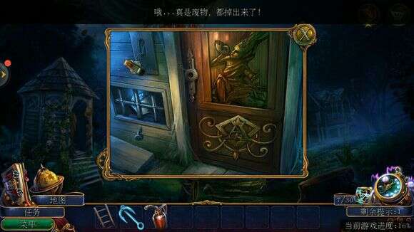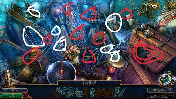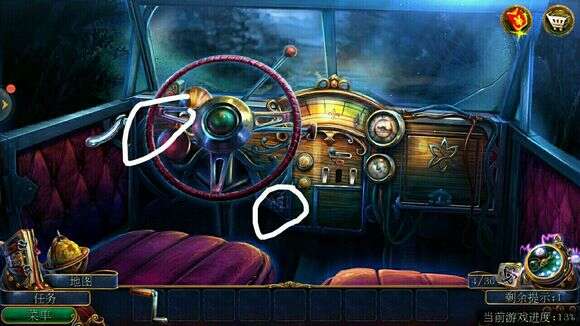开车到目的地点击方盘得到把手,从拼图那得到骷髅💀,邮箱得到刀子,用刀子砍断树枝把骷髅💀和把手安上去打开门🚪,从旁边的小木屋拿到梯子,木桩上拿到斧头把木屋上木板砍断并完成游戏得到锚,从门下面拿到注油器和旁边的开关