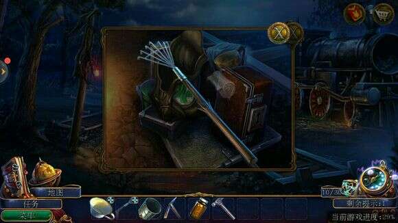 绳子剪断后得到绷带🤕止痛药💊锄头⛏锤子🔨,先用绷带🤕把耙子缠起来把树上的树枝给弄下来得到钳子,先去屋子里用锤子🔨把火炉上钉子取下,用锄头⛏把煤炭弄碎得到钉子,用钳子去火车下面拿到钉子,然后返回到狗狗🐕的地方把钉子弄到电线杆上得到开关,把开关放到火车头下面得到按钮
