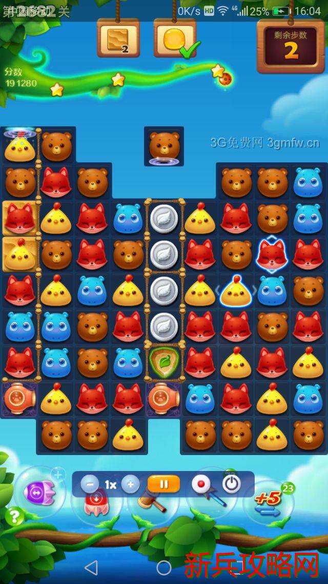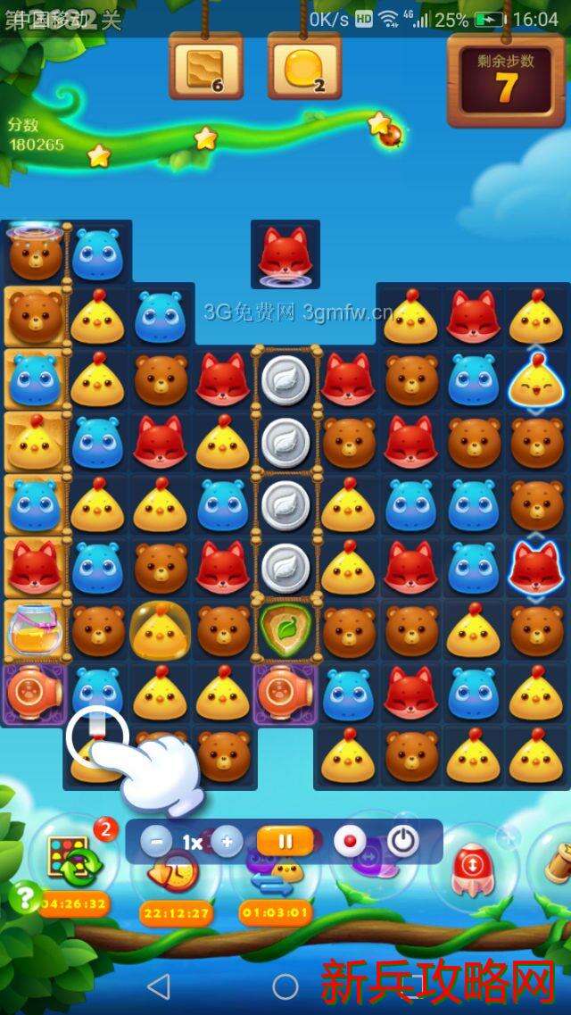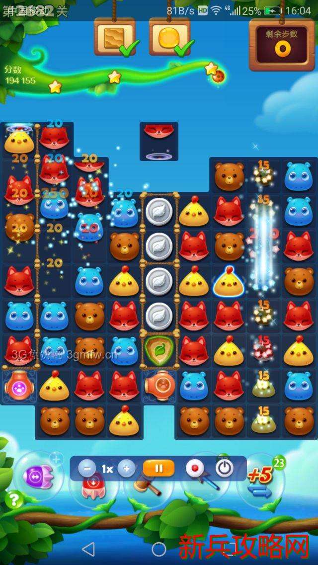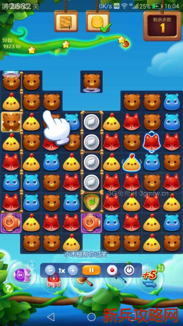 随便交换两个特效开局,消除雪块和流沙点亮星星瓶交换,然后主打魔法石和魔法炮消除蜜罐和流沙。