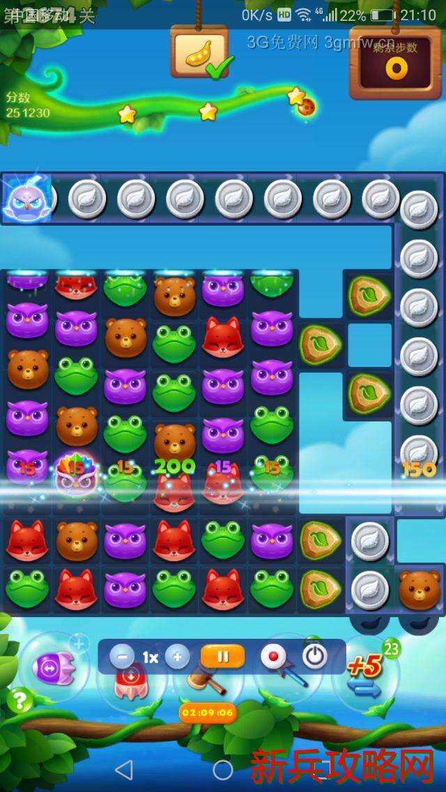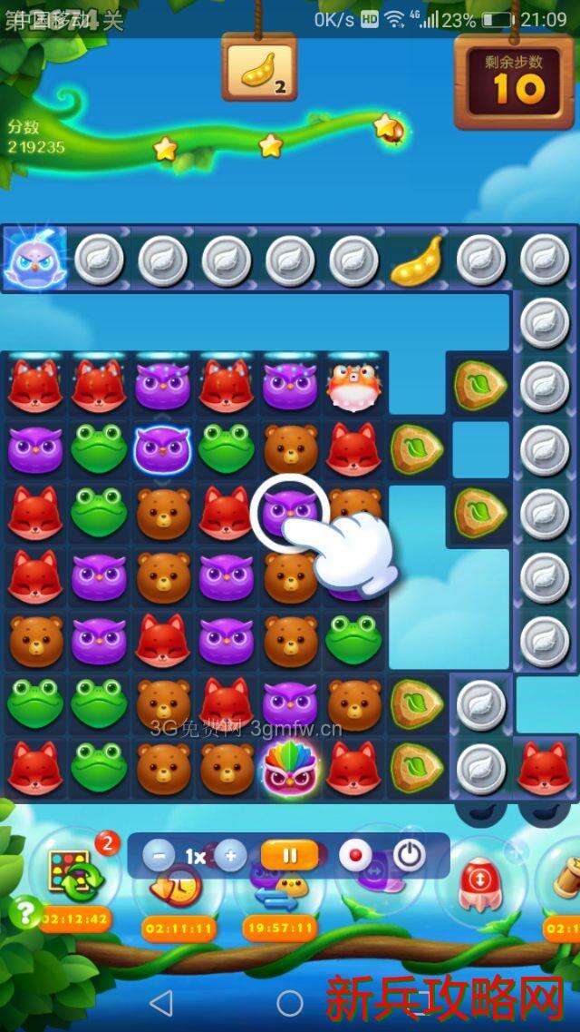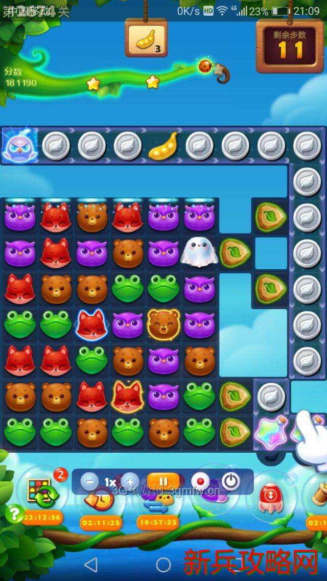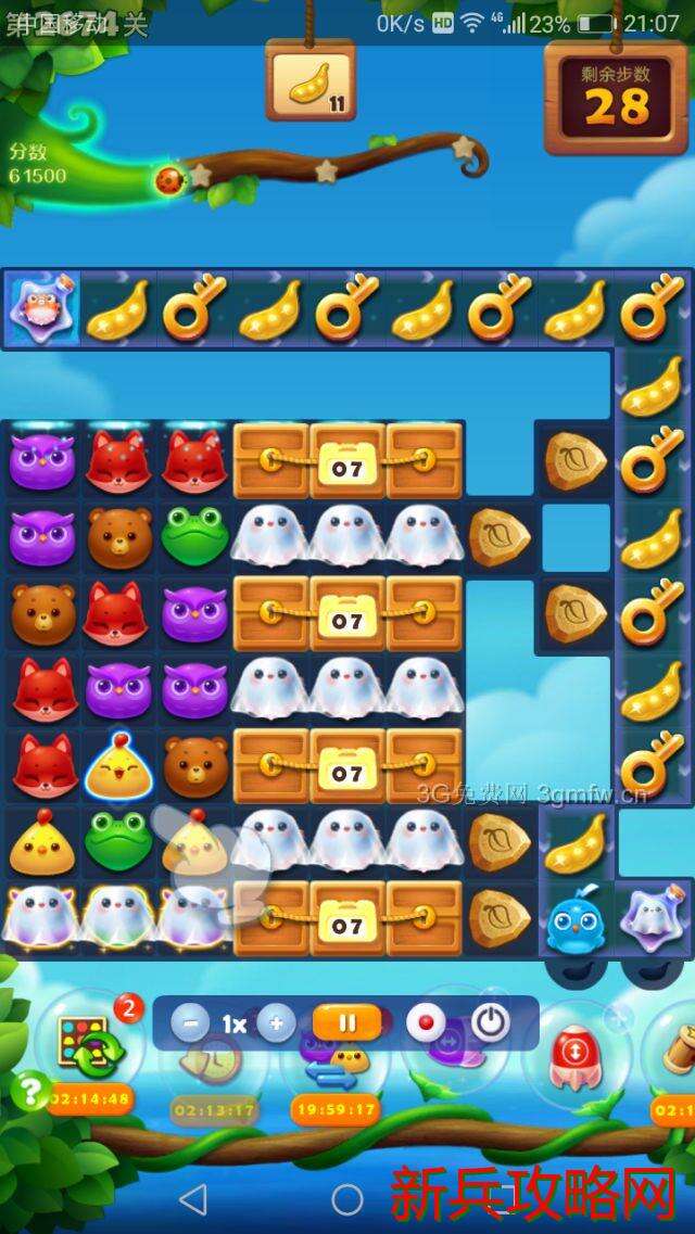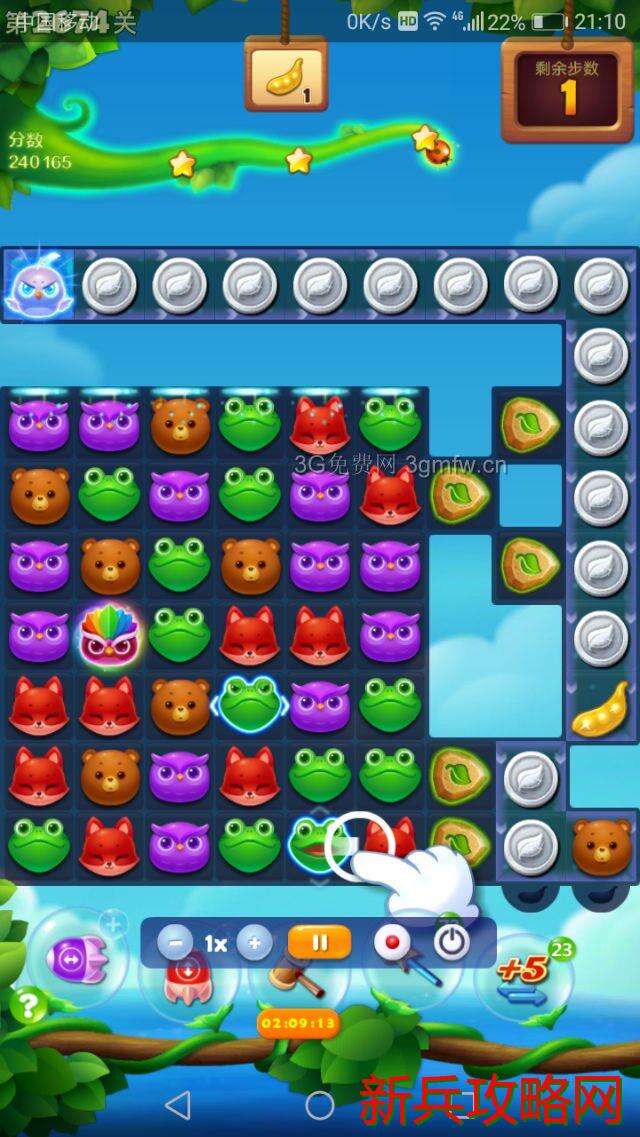 送走左下方3个小幽灵点亮星星瓶交换闪电鸟,消除气鼓鱼点亮星星瓶交换,打魔法石消除银币收集剩余豆荚,如果两个星星瓶不互换,分别交换银币效果也不错。