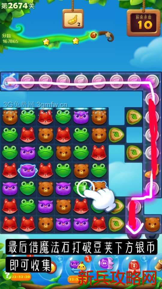 简单说明,这关后期收集豆荚依靠魔法石帮助 三星分数:205000
