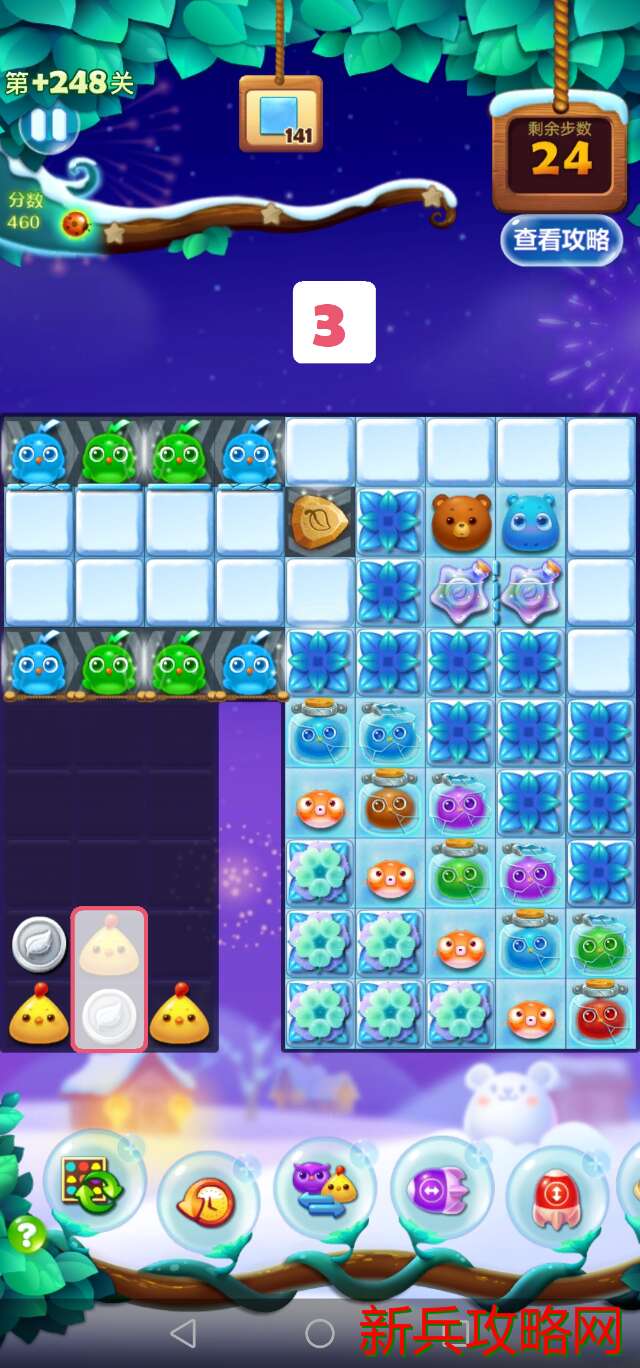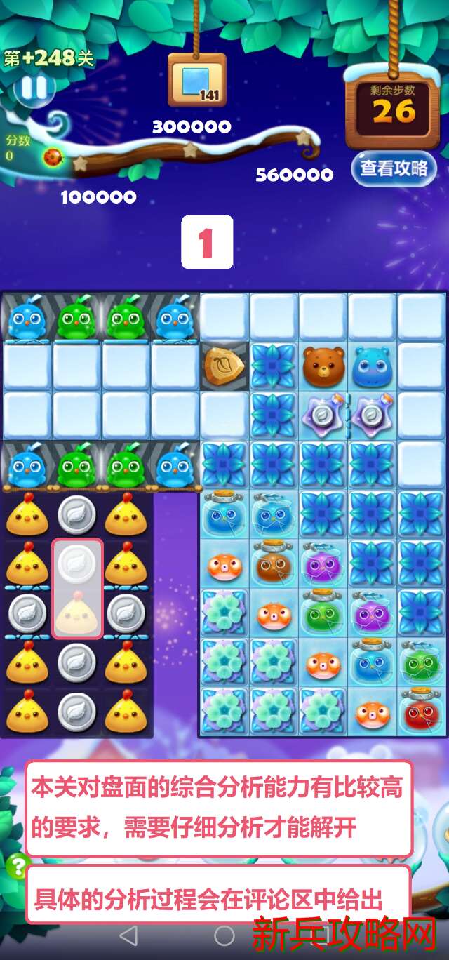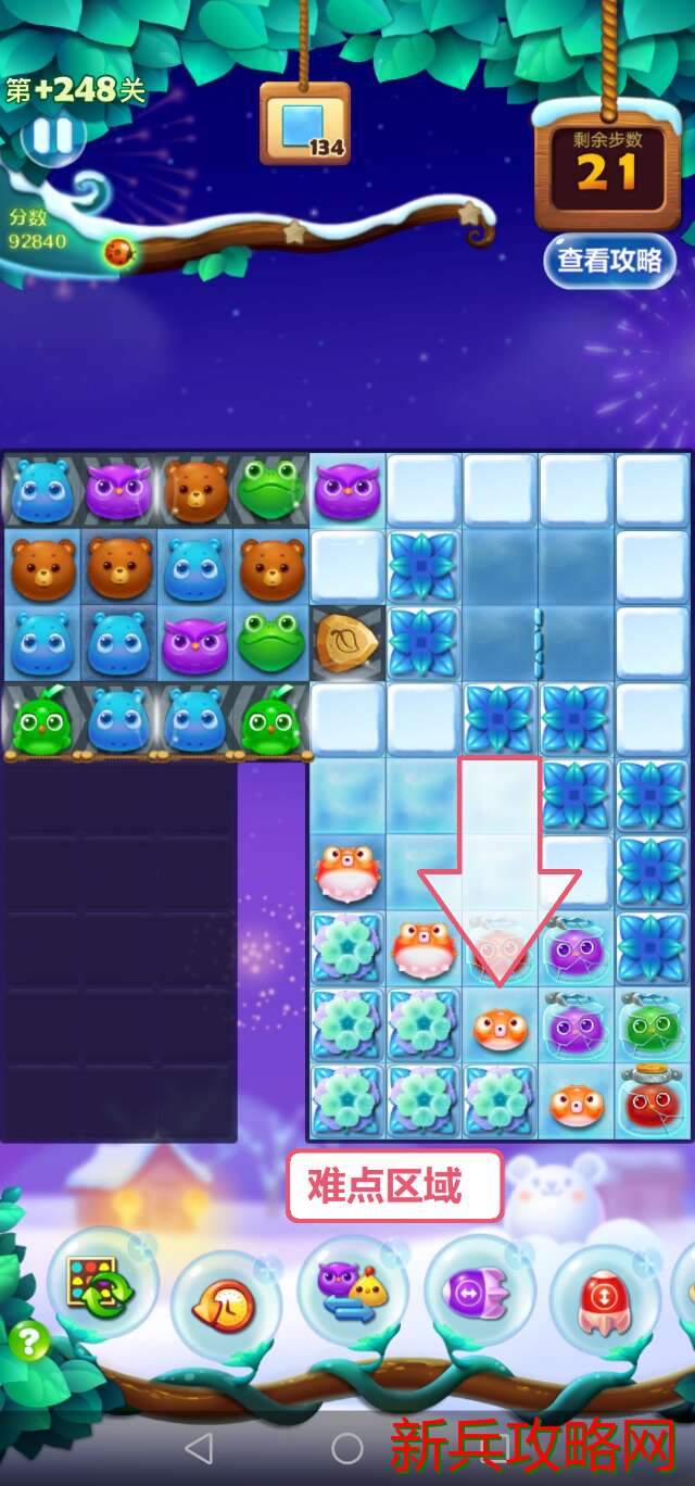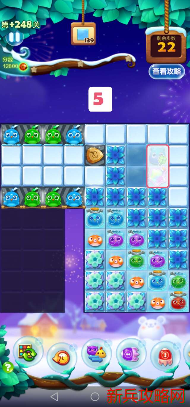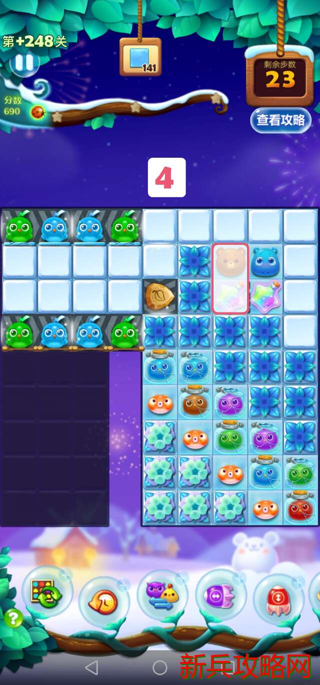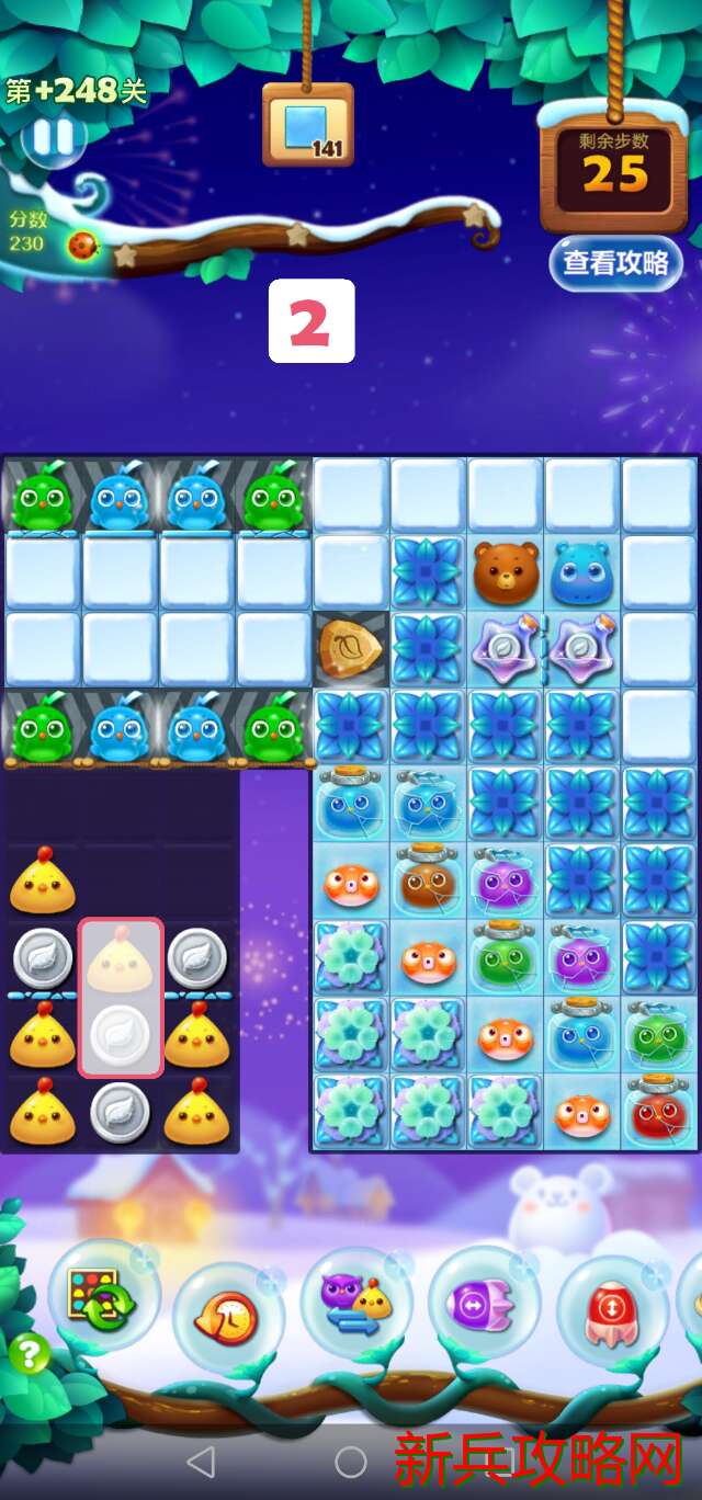 移动第一步时就要预测到接下来几步能否消除全部银币,这就意味着需要推测出移动后的局面,再判断某种走法是否可行。通过推测可以发现,第一步中中间的🐔只能往上交换,否则最多两步就会死局。到第二步时,也用同样的方式分析,得出除了将中间的🐔下移之外的其他方案都会产**局的结论。选择第四步的移动方式时,注意看左上角冰柱的厚度,如果直接吸蓝色有可能会导致局面打不开而死局,所以先用左边的星星瓶,等到下一步蓝色闪电鸟移动到二层冰柱处时再使用右边的星星瓶。