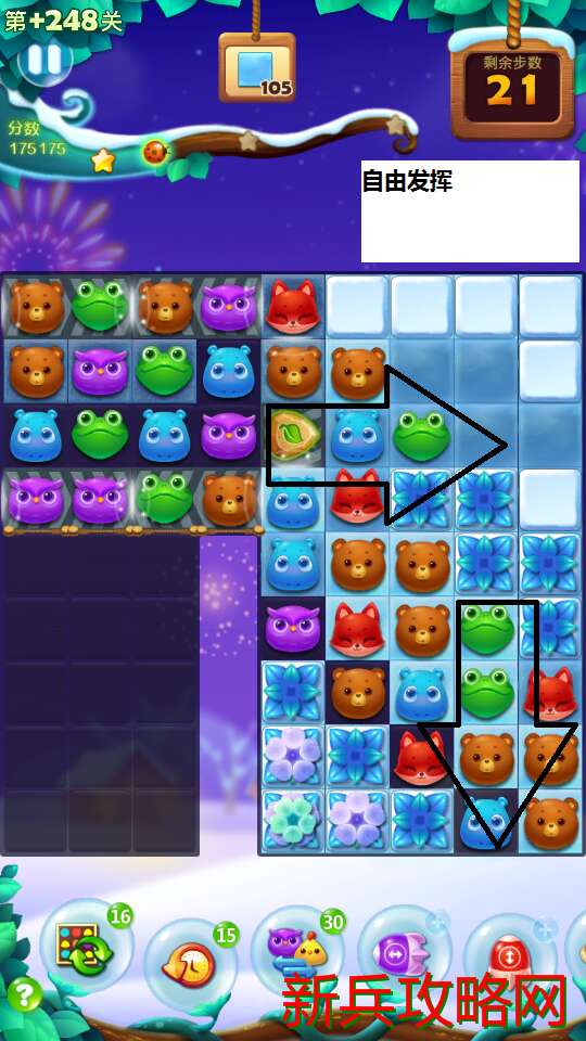 开局左下角层层收集金币,点亮星星瓶,星星瓶与动物交换,先左侧,再右侧,然后左上角闪电激活,激活魔法石,利用魔法石攻击右上角,右上角向右下角推进,右下角冰层很厚,容易烂尾,开局对了,过关比较容易,祝福好运