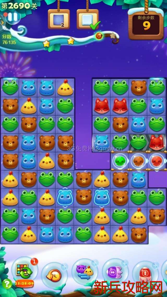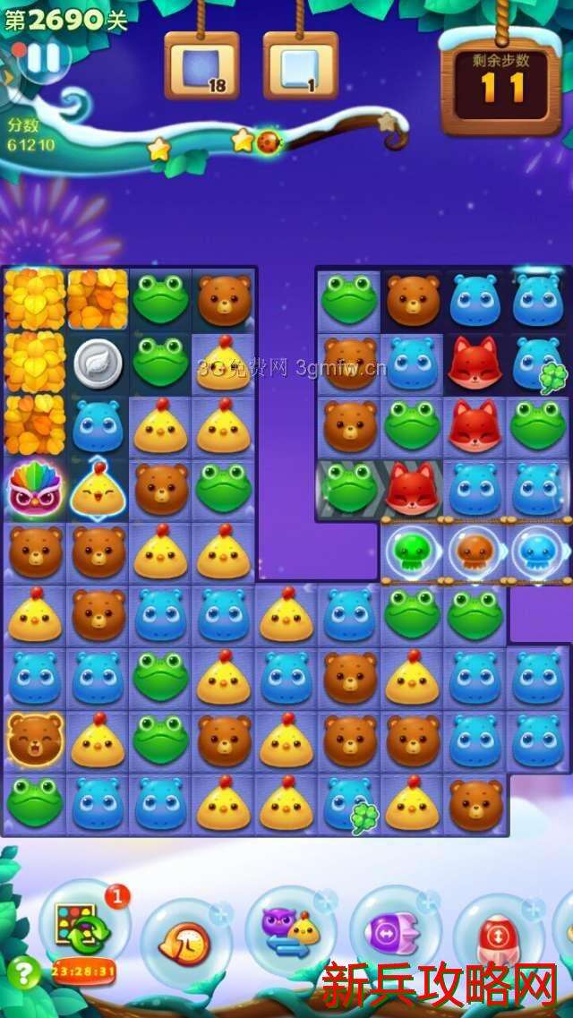 开心消消乐2690关卡裸过关。这关玩了几次,不过关,点了个30分钟无限精力瓶。开始右下角固定打爆一只花团,花团散开,左右上角的一只白幽灵消失。打爆右上角的贝壳出水母,水母特效消除右下角的磁力罐,右下角的小动物或特效往左边移动往左上角,如果在左边中间组成了爆炸特效和爆炸特效,树叶块就容易消除掉了。在左上角组成一次魔力鸟和直线特效互换,蓝染色体差不多染完,移动一两步,染完成蓝布兜过关。