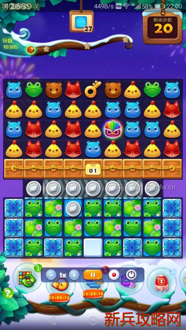 消除雪块后打气鼓鱼送走墨鱼并收集全部钥匙打开宝箱,打气鼓鱼往下消除扩大空间,组魔力鸟和特效消除荷塘。